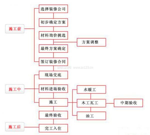 想要住進一個家,必要的步驟就是裝修,那么又該如何裝修,不論是自己裝修還是找裝修隊,哪怕是全部交代給裝修公司,對于裝修流程,我們也很有必要了解一下,這樣,我們裝修起來心里才有底,以下裝修流程圖也許能夠在裝修過程中對你有所幫助。