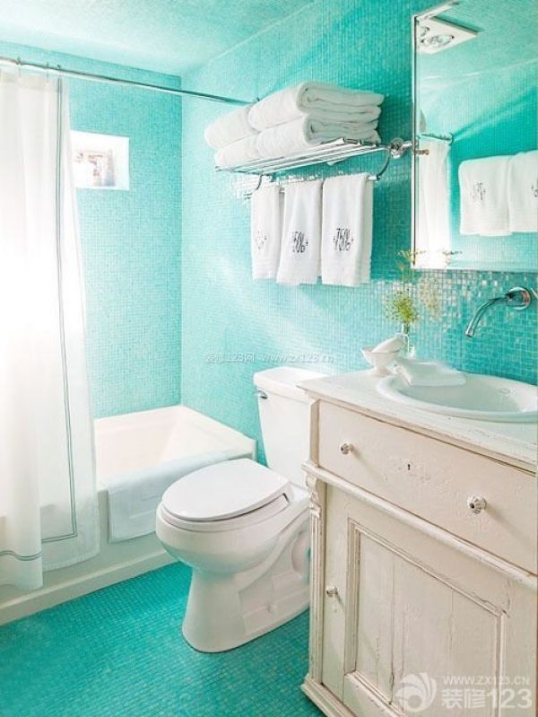 三、清爽的色彩總是能提升空間的亮麗度。狹長(zhǎng)的衛(wèi)浴空間放下座便器以及小巧的臺(tái)盆剛剛好,一邊攔出一個(gè)小空間,掛上簾子就是淋浴區(qū)了。墻角的空間完美的劃分成了淋浴區(qū),一旁放置的收納柜以及墻上的收納架都很好的將小空間利用了起來。