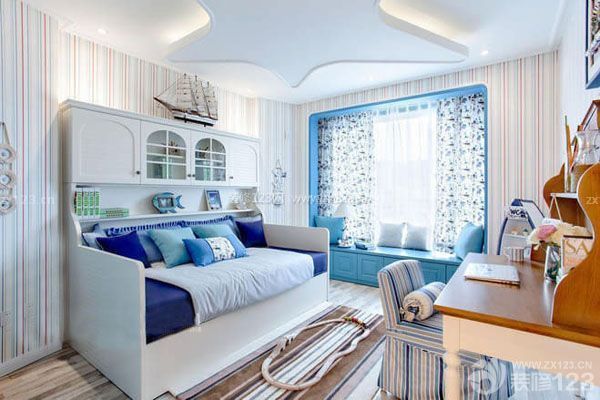 地中海裝修風格一般多用藍色、白色和黃色等比較自然的色彩才突出這個風格清新淡雅的海邊風格,在地中海風格兒童效果圖中在顏色的合理搭配下似乎跟人一種地中海具有的浪漫與唯美,不可否認的是兒童房采用地中海的風格,顏色搭配上就會給孩子營造一個輕松的環境,孩子在這樣的環境下生活也會覺得很輕松,有利于身心健康發展,地中海風格兒童房設計則是抓住了孩子對顏色搭配的需求。