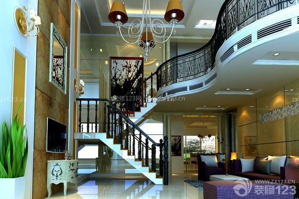 復式樓上的扶欄也是一大亮點。在充分考慮到安全性的前提下,樓上的扶欄常常注重突出裝飾性。大體有圓弧型或直線型,生活中采用曲線方式的比較多,使空間在視覺上有一個靈動的變化。