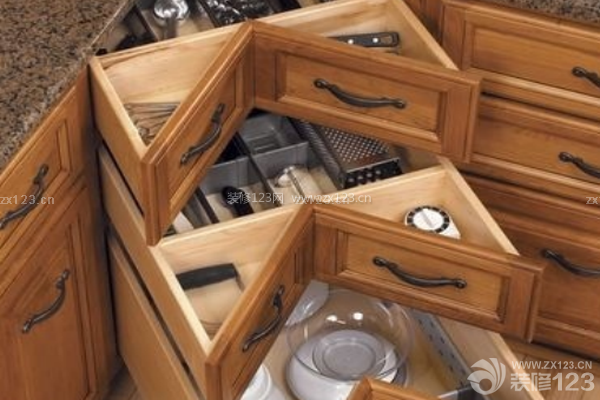 水槽下、冰箱上、櫥柜,為了將大量的廚具裝進廚房這個小小的空間里,我們的主婦、男士們那可是想破了腦袋,將廚房各個地方能利用的地方都給利用了起來。但是有一個收納性超強的地方卻總是容易被忽略,那就是廚房拐角。可是怎么將拐角給合理利用起來呢?