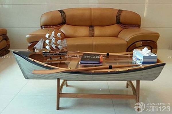 一款以船為主題的茶幾,不僅形狀模仿了經典的木船造型,其內部結構也是原樣復刻,如果不是覆蓋了一塊玻璃面板而作為茶幾使用,說不定就能以假亂真。
