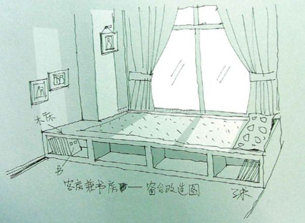 客房的衣柜位置偏小。經過與業主溝通后,決定舍棄傳統的床的概念,將原有的大凸窗延伸進房內,順勢做成一張床。床位改成一個超大的近40厘米高的地臺,地臺下設有4個抽屜,可以放置書刊雜志等零碎物品,上邊只需要鋪上一張10cm厚的床墊即可成為一張舒服的大床了。