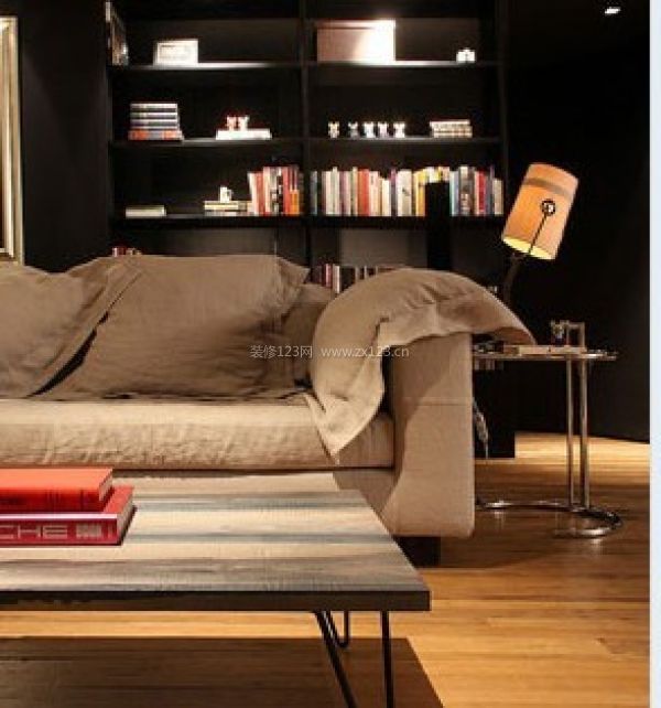 中性色在這個客廳空間唱著中心旋律,原木色地板很顯品味,棕黃色的布藝沙發有著溫暖的情調,木質茶幾的色調幾乎和沙發相近,凝練了整個空間的肅靜華貴的氣質。明亮的白色燈光讓人眼睛一亮,為這個色彩有些沉悶的客廳增光添彩。