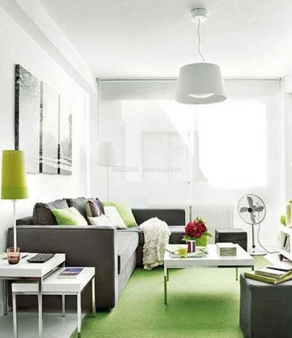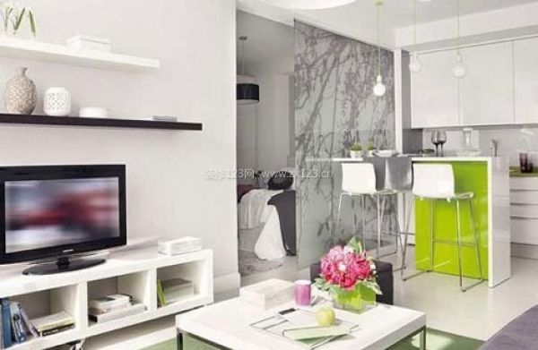 在這間40平的小戶型裝修案例中,綠色的運用起到了極大的作用??蛷d中無處不在的綠色元素簡搭白色墻面,讓客廳舒適明亮又輕快,也是擴大小戶型客廳視線的最好方法。配套的四角形茶幾和小柜子,讓客廳空間穿插著利落分明的通透感,沒有太多修飾反而更令人耳目一新。