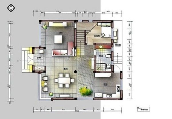 一樓平面圖一樓將原有的車庫加高改為客廳,把原來的入戶門向外推,確保了空間的完整性和寬敞性,將原來面積不大的櫥衛空間均面積最大合理化。一層公共空間沒有做刻意的三維區域分割,只是在地面上按不同使用功能作了不同的拼花處理,顏色采用我個人認為較個性、高雅的灰度咖啡調。
