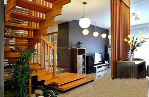 開放式的空間處理,步入玄關以后,別有洞天的設計,木質閣樓樓梯,使得整體空間平添一份溫馨與自然。