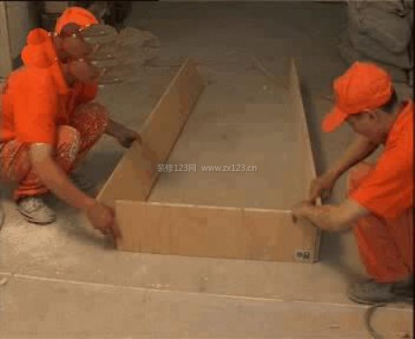 4、立套子板:立套子板前須將設(shè)木磚處的墻體和套子板內(nèi)側(cè)涂上專用膠,再將套子板放入門洞并校正位置和垂直度。