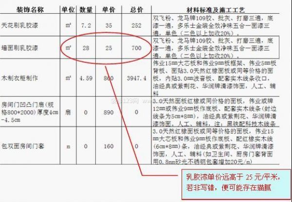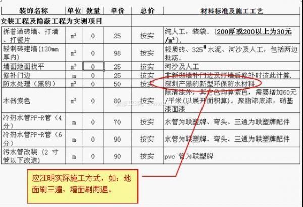 許多業(yè)主在查看報(bào)價(jià)單的時(shí)候,只盯著數(shù)字看,對(duì)于文字說明很少關(guān)注,這是非常錯(cuò)誤的做法,因?yàn)槲淖忠话闶亲鳛闂l款補(bǔ)充而存在的,大都注明施工工藝和要求。有的裝修公司就會(huì)在上面做文章。比如刷墻,正常作業(yè)是刷3遍膩?zhàn)臃?,可文字說明上只有2遍,這樣下來就嚴(yán)重影響了你的裝修質(zhì)量,而裝修公司卻平白的賺了你一筆錢,墻面掉漆、衛(wèi)生間滲水這些現(xiàn)象大都是施工質(zhì)量不過關(guān)造成的。