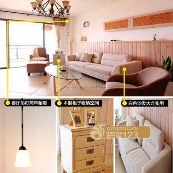 點評:白色沙發跟米白色柜子色調相近,搭配起來不顯得突兀。沙發和吊燈款式簡單卻顯得大方,木制柜子安置在這里很實用,可以把一些雜物放在里面,而不至于使客廳雜亂無章。