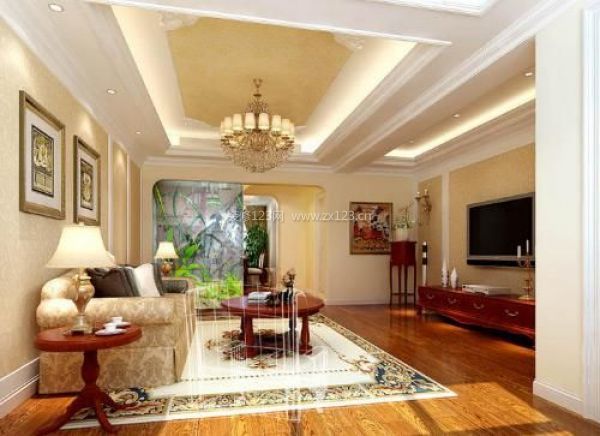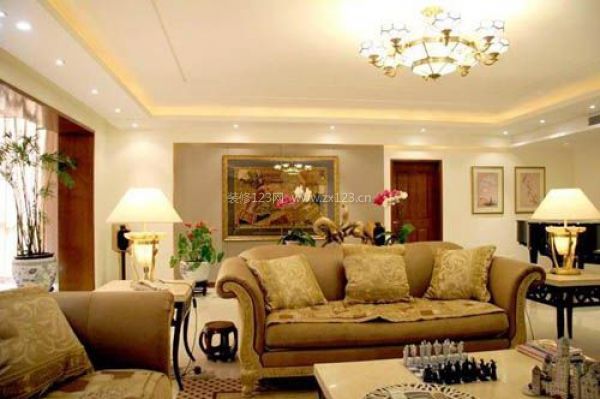 此款客廳設計具有濃烈的歐式風格特色,采用暖色調的沙發與沙發背景墻在色彩上形成完美統一,渲染出客廳的高貴與奢華,沙發背景墻上的兩幅精美裝飾畫,提升了客廳的歐式整體氣質,柔和燈光灑在沙發背景墻上時客廳的空間立體感得到完美呈現。