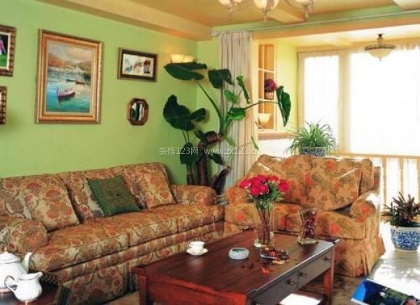 選用暖色調的花紋圖案布藝沙發裝扮客廳,為客廳增添了一股濃濃的溫馨氛圍,沙發背景墻采用綠色壁紙裝扮,瞬間使客廳傳遞出縷縷清新氣息。背景墻上懸掛的精美裝飾畫,與沙發背景墻在色彩上形成鮮明對比,仿佛正游走在山水之間。擺放一株綠色盆栽植物為客廳增添了些許生機與活力,仿佛感受著清新自然的田園氛圍一般。