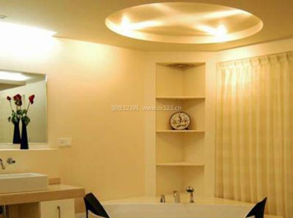 浴缸的上方,用一個(gè)與之呼應(yīng)的圓形造型作為吊頂?shù)闹饕O(shè)計(jì)符號(hào)。原本簡(jiǎn)單的空間,在圓燈池里排列有序的燈光映照下,平添了幾分奢華與感性。