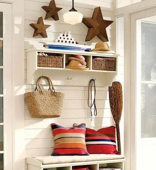 透明的玻璃門也很適合用來做玄關隔斷,白色的框架門,很有地中海風風情的裝修,彩色抱枕很好的裝飾了玄關的色彩。