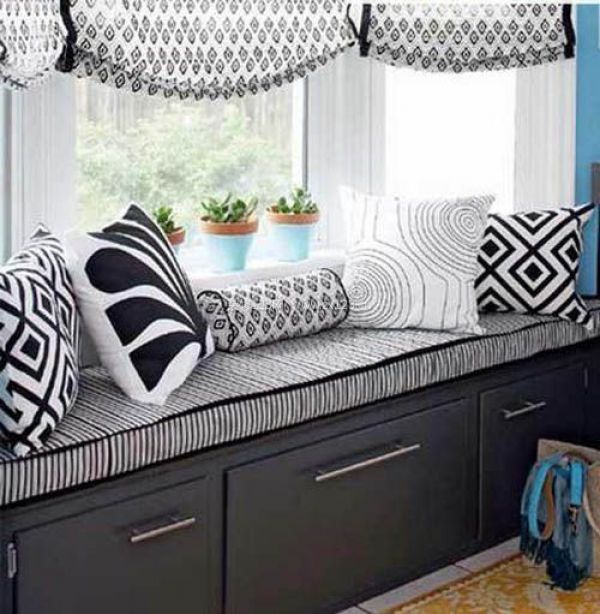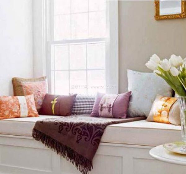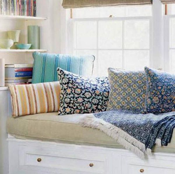 白色木框窗戶適宜搭配清新的白色木質軟榻,榻下是收納物件的抽屜,榻上擺上柔軟的靠墊,構筑一方愜意閑適的角落。