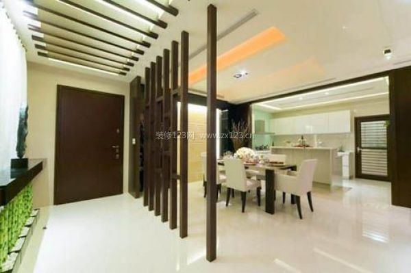 開放式的玄關(guān)需要的是一種若隱若現(xiàn)的區(qū)域,可以通過吊頂?shù)脑兀c其他空間有所區(qū)分。