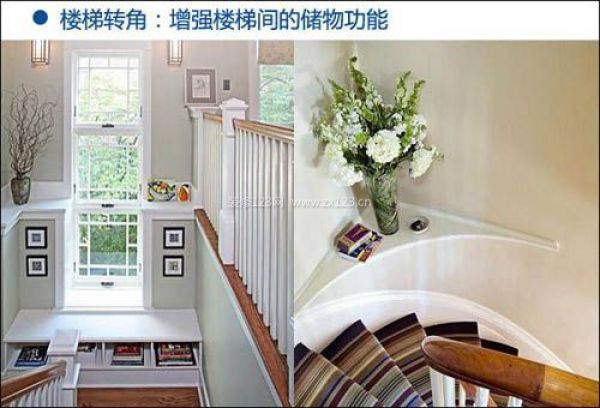 設計技巧:樓梯轉角設計往往會被大家作為重點裝飾區,像這種設計成榻榻米的書臺,也就相當于增加了一個小書房。螺旋造型的樓梯間與墻角額外設計的墻角擱架,讓樓梯小角落驚艷無比,弧形的人性設計,讓行走時不會被碰到,不僅可以擺上插花作為樓梯間的裝飾,還能放上幾本小書讓腳步留住。