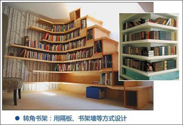 設計技巧:像這種轉角墻面設計很有新穎,通過支架隔板的方式改造成帶有儲物空間的墻面,帶有很好的收納空間。用書架做了轉角延伸,讓角落的每一個細節都趨于完美。講求空間的實用性,同時也更注重其美感。