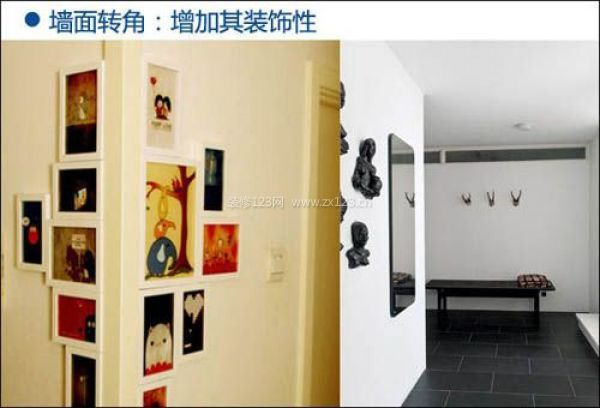 設計技巧:墻面轉角利用相片墻的設計形式對其裝飾,通過相框的點綴讓原本黯然失色的墻面帶有與眾不同的活力與新鮮。也可以通過鏡子、雕刻的藝術畫對其修飾,特別是對小空間而言,它更能在空間上得到一種延生感。
