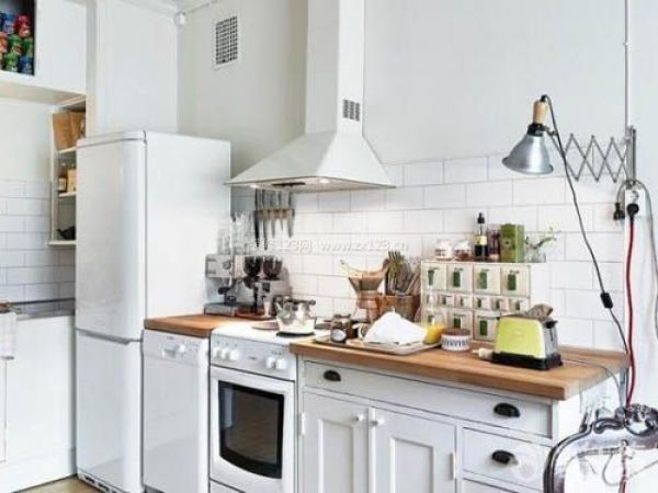 小面積公寓廚房一般都是按小尺寸的冰箱制定出空間。不妨給大冰箱制作一個外衣箱,側(cè)面可以適當(dāng)點綴一下,看起來整潔美觀。