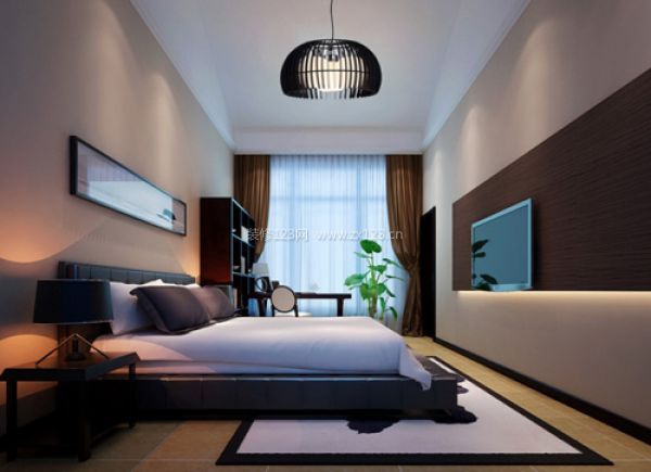 次臥室沿襲了整體的古典品味,整個空間沒有中式元素,但卻給人一種中式禪意的意境,追求一種精神上的享受。極具現代感造型的燈具以及床體,在用色方面極力配合意境深遠的掛畫,給人一種典雅的尊貴氣質。