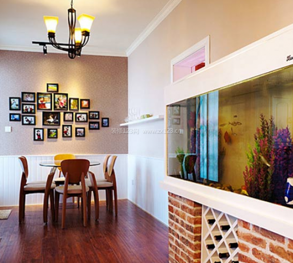 照片堆砌成為餐廳裝修設(shè)計的背景墻,不但大方好看,還在小小墻面展現(xiàn)家庭生活的點點樂趣。內(nèi)嵌式的浴缸和紅酒架為空間增加了許多情趣。