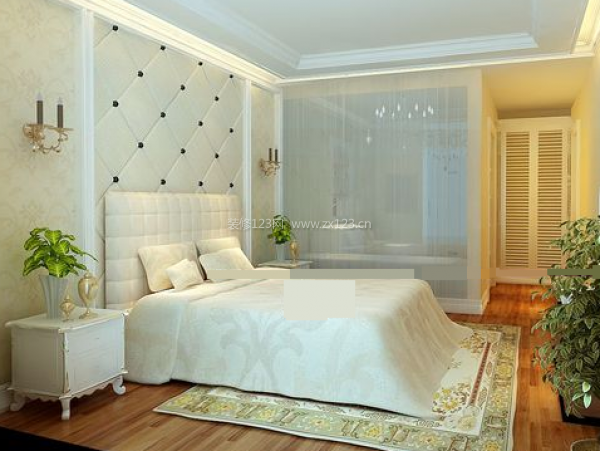 素白的床盡顯高雅和華美,綠色的盆栽為該臥室裝修設(shè)計(jì)增加了新的生機(jī)。