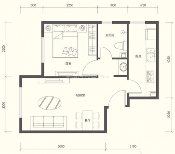 該平面設(shè)計(jì)圖清楚的展示了這個(gè)居室每一個(gè)功能室的面積和布局。還可以看到,每個(gè)房間放下家居后,仍然剩下了十分空曠的空間。