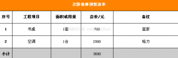 次臥的裝修預算清單如下。