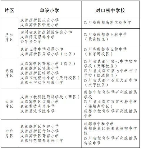 大源片區:市教科院附屬學校、市教科院附屬中、石室天府(錦城湖校區),面向“升學區域”為益州小學、市教科院附小(西區)、蒙彼利埃小學、墨池書院小學4所單設小學的符合條件的畢業生,實行多校劃片電腦隨機錄取。