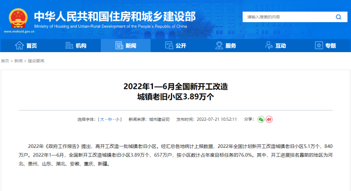 21日,住建部發(fā)布2022年16月全國新開工改造城鎮(zhèn)老舊小區(qū)數(shù)據(jù)情況。
