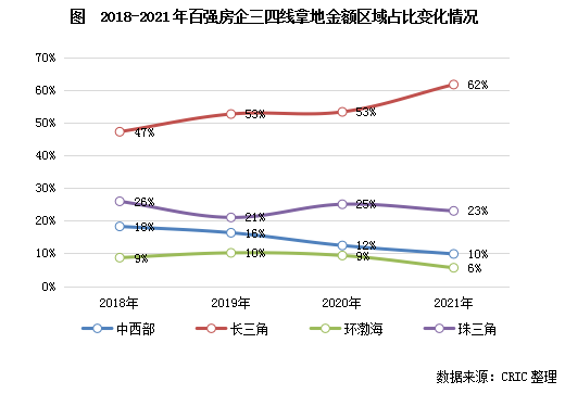 在三四線拿地金額分布的變化上,房企對不同區域的偏好程度出現了較大差異,投資結構也發生明顯改變:自2018年以來,房企在長三角的投資占比持續增加,2021年長三角區域的占比達到62%,較2020年增加9個百分點,較2018年更是大幅提升15個百分點。