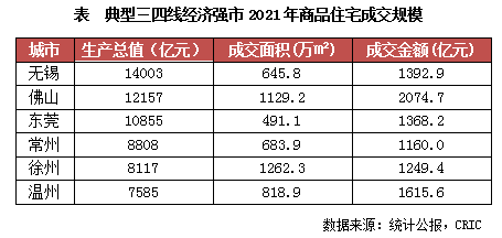 這些城市商品住宅市場成交規模亦處于同能級前列,其中佛山得益于廣佛同城帶來的大量需求導入和購買力支持,其成交金額更是達到了2074億元,超過了合肥、長沙、濟南等二線城市。無錫、東莞、常州等城市2021年下半年市場成交熱度雖大幅降溫,但在大規模的經濟體量之下,城市的住宅需求總量依舊處于三四線前列,全年的商品住宅成交金額仍可保持在千億水平以上。