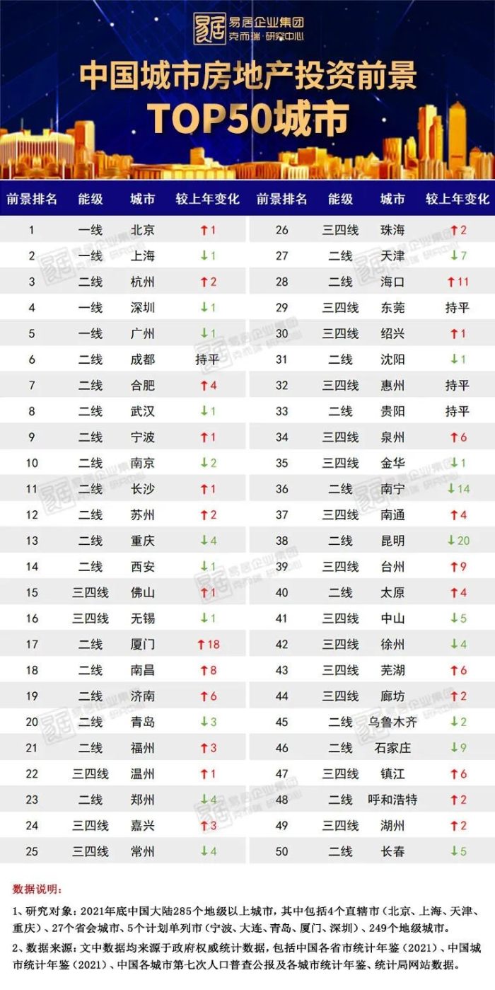 從資源集中度情況來看,前景排行TOP50城市中有19個三四線城市,較去年增加了2個。就2021年數據來看,這50個城市擁有全國34%的常住人口,集中了51%的GDP,這些城市商品住宅成交金額占總成交的比例達55%,集中度對比2020年均有小幅回落??梢钥吹?,在行業發展出現波動的情況下,TOP50城市的規模優勢縮小,城市間的發展與位次競爭也出現了進一步變化,而那些供求關系較佳、購房需求充足、企業拿地利潤預期看好的城市,如杭州、合肥等,也更有望在2022年下半年率先走出行業復蘇的行情。