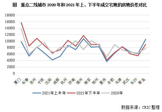 在拿地成本下降的背景下,多數城市的房價保持穩定,部分限房價的城市如杭州、成都、長沙、寧波等還在第三輪集中供地中進一步上調了商品住宅銷售限價,房地價差空間被進一步擴大。17個城市中,約七成的城市在2021年下半年成交涉宅地的房地價差明顯高于上半年,僅長沙、青島等少數城市因成交結構更偏向房價較低的郊區而導致房地價差空間縮小。再與2020年相比來看,仍有過半的城市在2021年下半年的房地價差水平超過2020年,利潤空間明顯擴充。