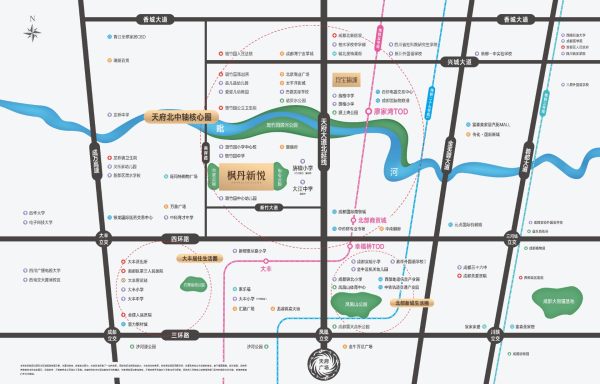 合能楓丹新悅位于新都區大江中學(在建)旁。毗河岸延線生態長廊的合能楓丹新悅,不僅有一河生態帶,還有成都諾貝爾公園、源上灣公園、濱河公園等三座公園,生態環境十分優越。