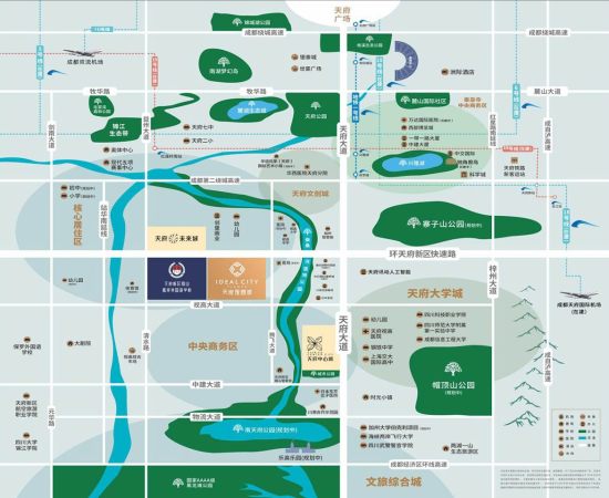 天府理想城怎么樣?天府理想城位于天府大道&環天快速通道交匯處黃金十字路口核心居住區,以近32萬方高品質純居住區。周邊有柴桑河濕地公園(建設中)、視高湖公園(建設中)、帽頂山生態公園(規劃中)、寨子山公園及城市綠心公園(規劃中),5大公園環繞。