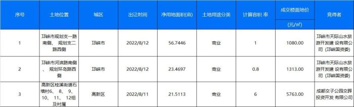 邛崍市第1宗土地出讓時間為2022年8月12日,土地位置位于崇邛崍市規(guī)劃支一路南側、 規(guī)劃支二路西側,凈用地面積為56.7446畝,土地競得者為邛崍市天際山水旅游開發(fā)建 設有限公司 (邛崍國資委),成交樓面地價為1080元㎡,土地用途為商業(yè)用地。