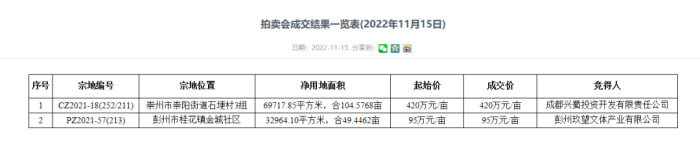 11月15日,崇州市拍賣出讓1宗百畝住兼商地塊,彭州市出讓1宗商兼住地塊。最終全部底價成交,成交樓面價分別為3150元/㎡、950元/㎡,競得者分別為成都興蜀投資開發(fā)有限責(zé)任公司、彭州玖望文體產(chǎn)業(yè)有限公司(浙江恒地控股)。
