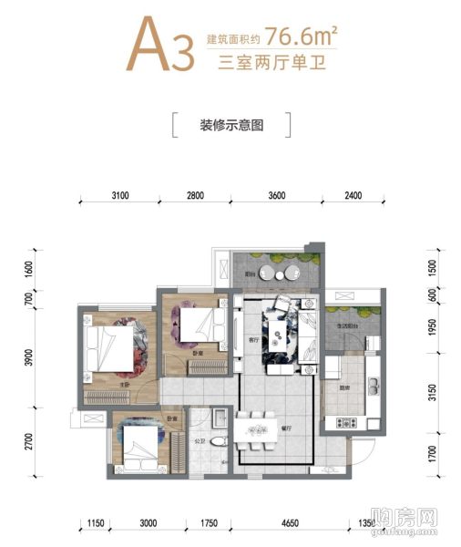 濱江睿城三期A3戶型(3室2廳,76.6平,南北)