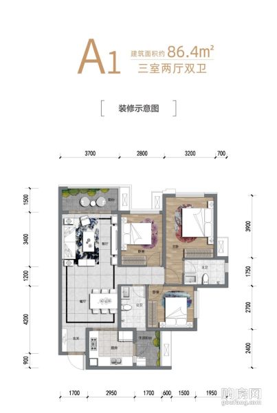 濱江睿城三期A1戶型(3室2廳,86.4平,南北)