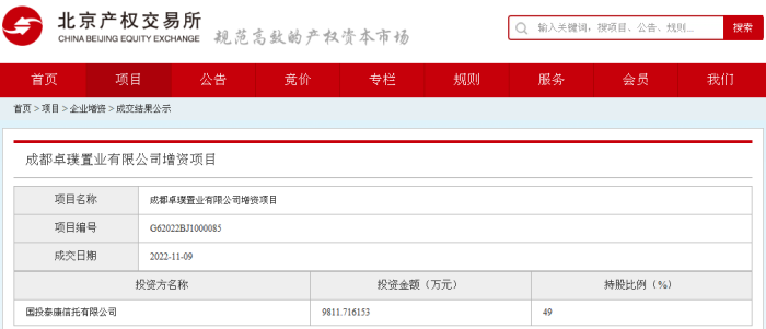 據(jù)北京產(chǎn)權(quán)交易所消息,“成都卓璞置業(yè)有限公司增資項目”已于2022年11月9日成交,國投泰康信托有限公司以9811.716153萬元成為投資方,持股比例為49%。