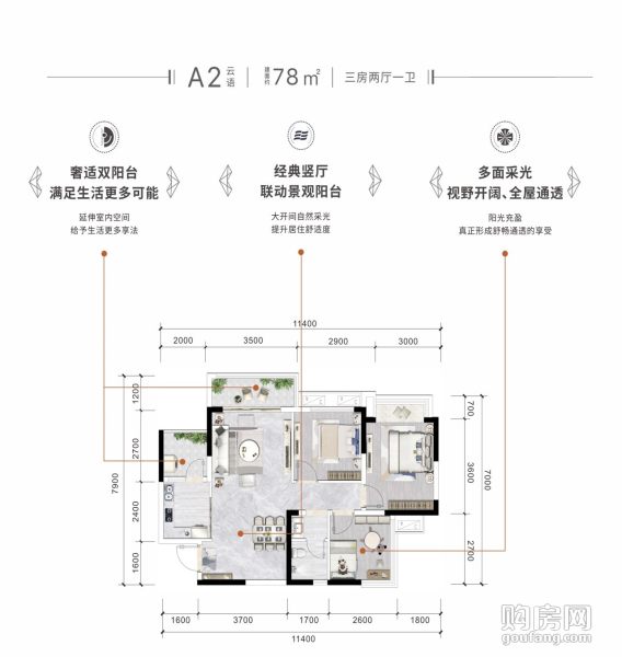 環(huán)天時代中心二期A2戶型(3室2廳,78平,南北)