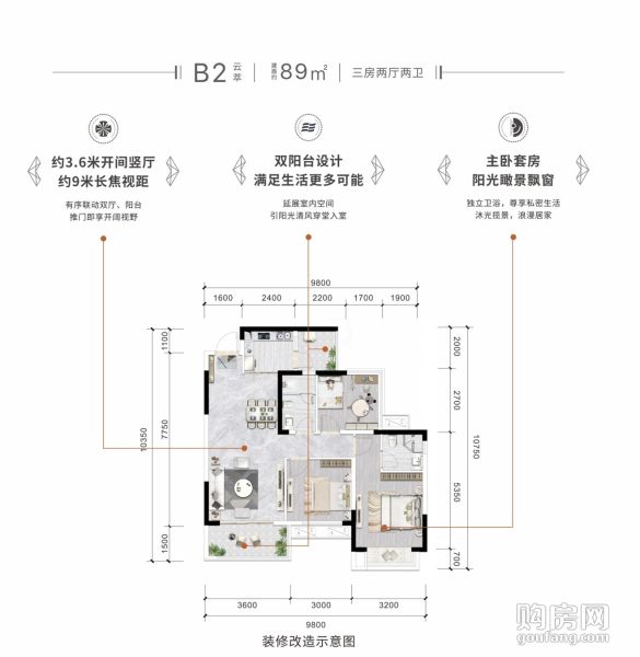 環(huán)天時代中心二期B2戶型(3室2廳,89平,南北)