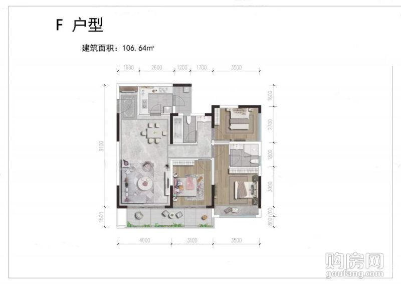 城投藝墅語湖F戶型(3室2廳,106.64平,南北)