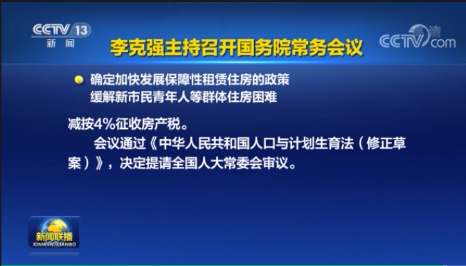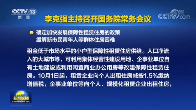 6月18日,國(guó)務(wù)院總理李克強(qiáng)主持召開國(guó)務(wù)院常務(wù)會(huì)議,決定從10月1日起,住房租賃企業(yè)向個(gè)人出租住房適用簡(jiǎn)易計(jì)稅方法,按照5%征收率減按1.5%繳納增值稅;對(duì)企事業(yè)單位等向個(gè)人、專業(yè)化規(guī)模化住房租賃企業(yè)出租住房,減按4%稅率征收房產(chǎn)稅。