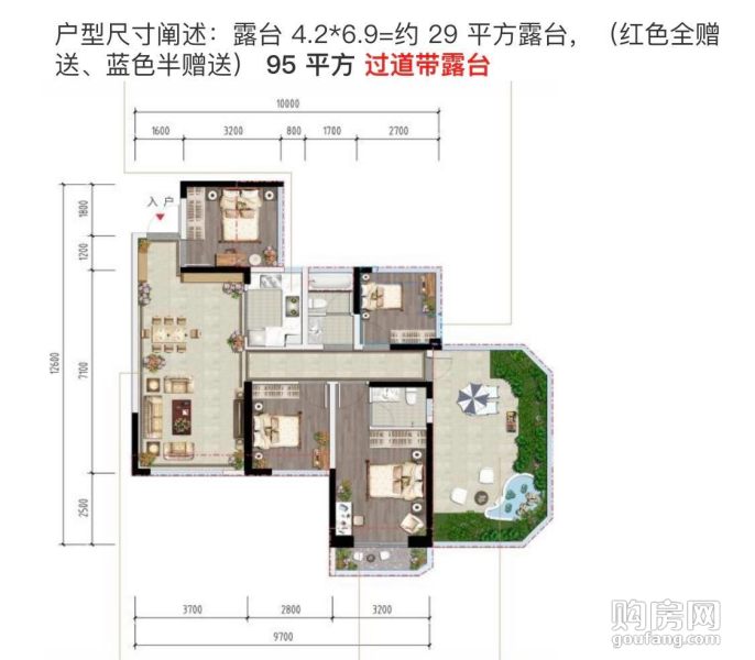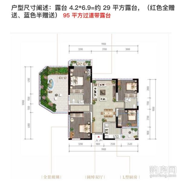 聚億天府錦城三期建面約95㎡過道帶露臺(4室2廳,95平,南北)